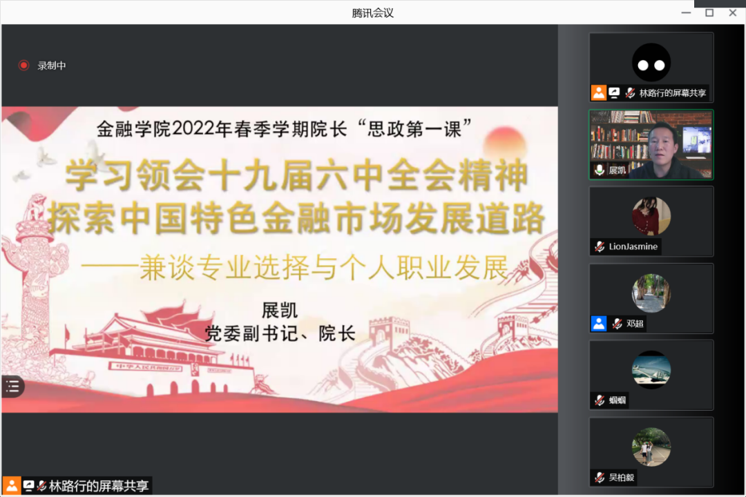 为向同学们宣讲好全会的重要意义,引导同学们思考个人发展之路,学院院长展凯以“学习领会十九届六中全会精神,探索中国特色金融市场发展道路”为题,面向全体2021级学生进行授课。
