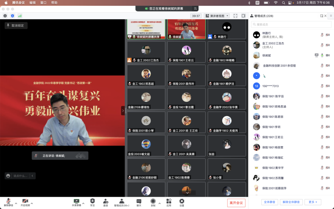 学院党委书记徐昶斌以“百年奋斗谋复兴,勇毅前行兴伟业”为题,从“镌刻史册的伟大飞跃,不可逆转的复兴进程”“气象万千的伟大时代,浓墨重彩的崭新篇章”“永葆初心的大党担当,伟大光荣的历史贡献”“弥足珍贵的精神财富,开创未来的行动指南”四个方面为200多位入党积极分子带来了一堂精彩的授课。他强调,“党政军民学,东西南北中,党是领导一切的”,只要我们坚定不移地坚持党的集中统一领导,中华民族一定会走向崭新的未来。”徐昶斌寄语金融学子,作为新时代的莘莘学子,应立足百年大党新起点,接力百年奋斗新征程,主动学习、深刻领会党的十九届六中全会以及通过的决议的精神实质,深刻认识以史为鉴、开创未来的重要要求,从党的百年奋斗历程中汲取智慧和力量,不断增强做中国人的志气、骨气、底气,不断坚定紧跟党走中国特色社会主义道路的信心决心,以优异成绩迎接党的二十大胜利召开。