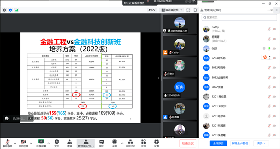 2022年8月20日下午3点,金融学院2022级金融科技创新班宣讲会在腾讯会议线上进行,学院展凯院长、党委徐昶斌书记、杨菁菁副院长、金融工程系主任张群、副主金剑锋及100多名2022级新生参加会议。辅导员吴凯茜主持会议。