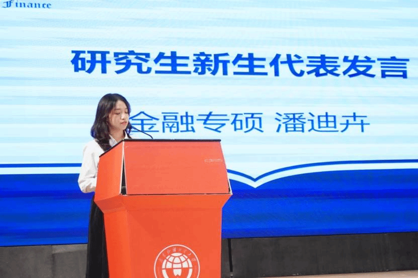 老生代表洪剑霞建议新生在入学后多看多问,利用校园内外的公众号了解信息,消除信息差,她鼓励大家勇敢尝试,跳出舒适圈,希望同学们可以拥有快乐而充实的大学生活。研究生新生代表潘迪卉表达了对未来在金融学院这片沃土成长的期待,也提出了关于如何脚踏实地追寻理想的思考,她指出,青年学生需要坚定理想、笃行不怠、融入集体,在校园中体验精彩、追逐梦想、拥抱未来。本科新生代表黄斌华表达了即将开始融入广外校园生活的期待与憧憬,对未来提升自我,充实自身的展望,并代表全体新生在教师节来临之际为老师们送上了节日祝福。