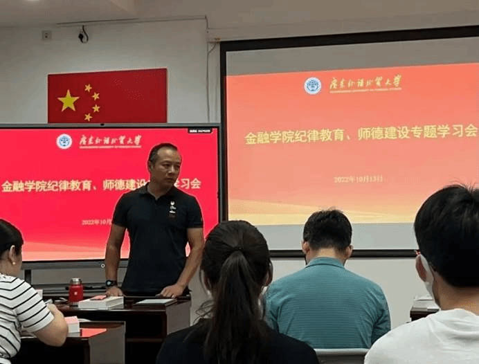10月13日下午,金融学院在院系办公楼404党员活动室召开党建工作推进会暨师德建设、纪律教育专题学习会。专题学习会结合工作实际,深入学习贯彻习近平新时代中国特色社会主义思想,进一步推进学院党建党务工作规范化,落实立德树人根本任务,持续加强师德师风建设,以实际行动迎接党的二十大胜利召开,会议由学院党委书记徐昶斌主持。学院党委副书记、院长展凯,学院党委副书记赵观音,校党委组织部组织科科长、学院院长助理王斌,院长助理邓超,系(室、中心)主任,组织员,师生党支部书记、支委、党员代表及学院党建服务中心学生骨干参加学习会。