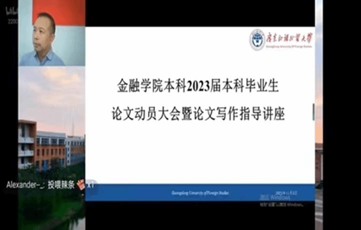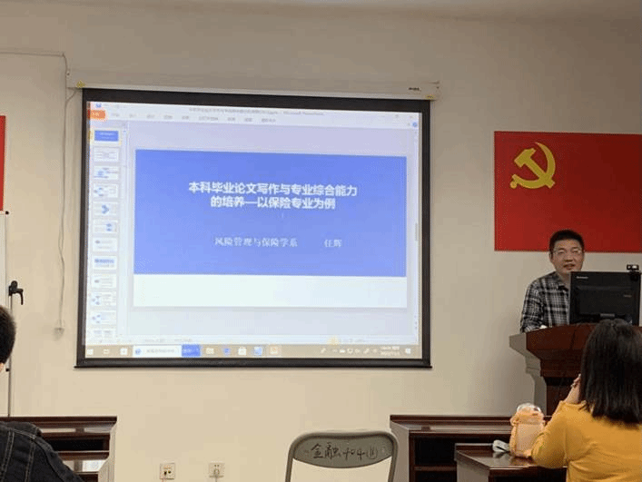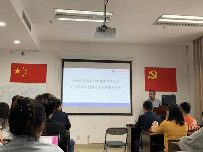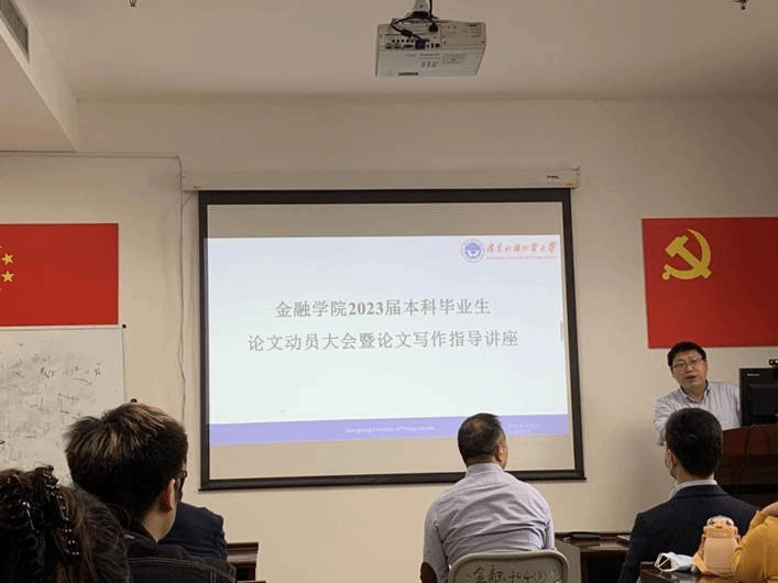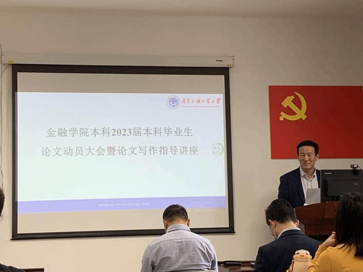 为进一步加强教学管理,提高论文写作质量,11月3日下午,我院举办2023届本科毕业论文工作动员暨论文写作指导会。学院院长展凯,党委书记徐昶斌,院长助理邓超,金融系副系主任邓洁、保险系系主任任辉、金工系系主任张群、投资系系主任吴柏毅,2019级辅导员刘天阳及2019级各班班委代表等出席会议。与此同时,会议通过哔哩哔哩平台进行网络直播,供其他学生收看。会议由党委副书记赵观音主持。