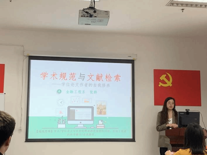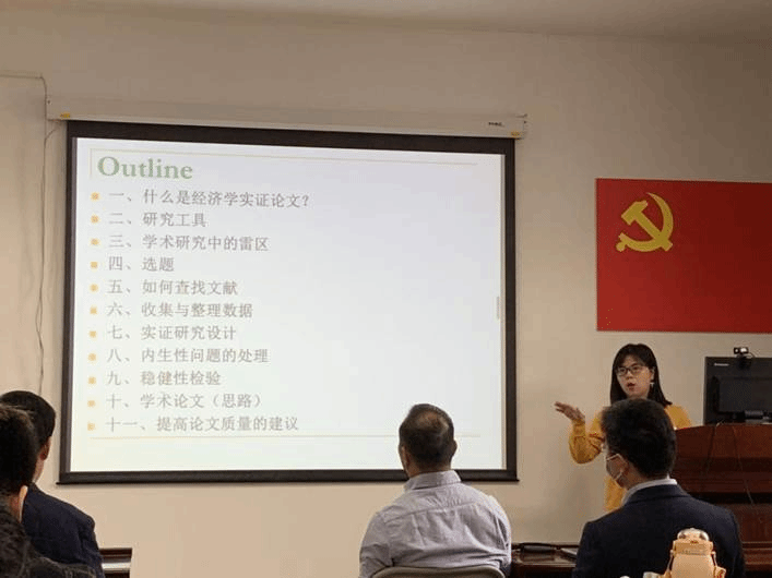 在论文写作指导讲座环节,邓洁从经济学实证论文选题、如何查找文献、论文框架设计和数据选择等几个方面进行指导,详细讲解了论文的撰写步骤;张群从大学本科毕业论文相似性度检测工作要求出发,分享了学术诚信规范,提出一些文献引用、文献检索的技巧,并提醒同学们避免学术不端行为;吴柏毅讲解了本科毕业论文答辩的主要流程和注意事项,提出一套辨证办法,指导同学们构思毕业论文的答辩要点,突出论文创新;任辉讲述了论文写作与专业综合能力的培养,对经济学思维能力、专业逻辑分析能力、专业实践运用能力、自我学习和创新能力、谋篇布局能力和专业写作能力五个方面进行详细讲解。