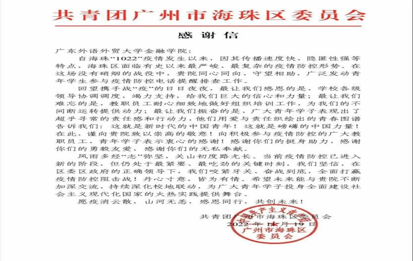 2022年,学院认真组织开展习近平新时代中国特色社会主义思想学习宣传贯彻活动,组织收听收看党的二十大开幕会,开展学习宣传贯彻党的二十大精神,持续推动新思想在学院落地生根。不断加强党建思政及党风廉政建设,落实巡视巡察整改,推进新一轮基层党建三年行动计划,完成基层党支部换届,加强师德师风建设,以夯实基础、打造特色、提升素质、服务发展为目标,全面提高党建工作科学化水平,“党建+”模式为推动各项事业发展提供了坚强保障。在疫情形势严峻复杂的时候,学院党委指导党建服务中心,联合海珠区团委,组建一支近200名师生的党员志愿服务队支援海珠区疫情防控工作,5天内完成5000多个电话流调任务。学院师生党员用行动诠释使命担当,受到广泛赞誉。