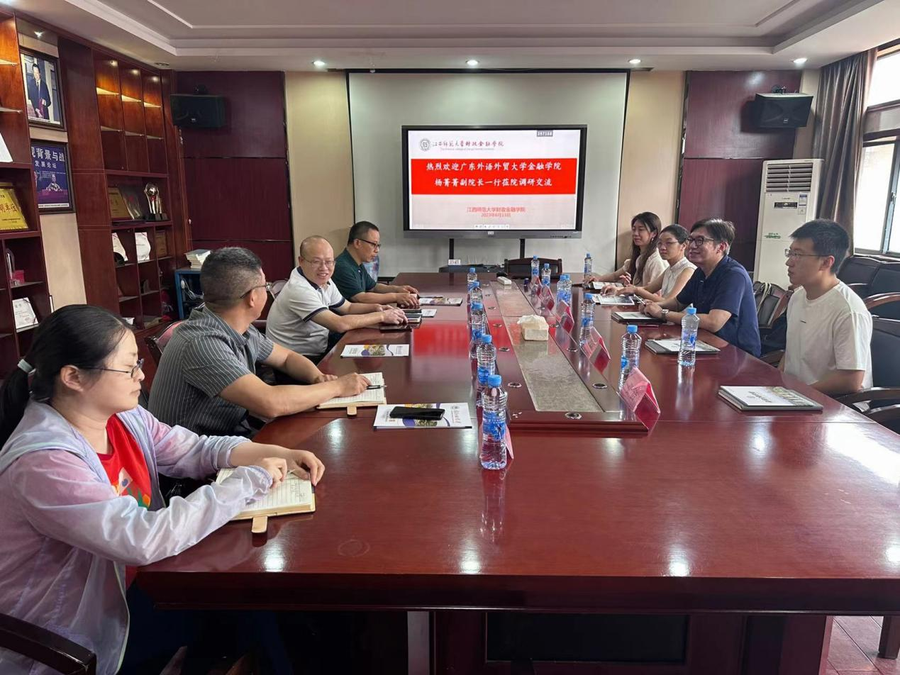 赣南师范大学经济与管理学院党委肖永忠书记、边俊杰院长、孙剑斌副院长、专硕点负责人肖晓军博士,江西师范大学财经金融学院黄小勇院长、邓久根副院长、付剑茹副院长、李兴平副院长、党委江新喜副书记、国际金融研究院李云峰副院长、国际教育学院熊智伟副院长,南昌大学经济与管理学院况学文院长、邵汉华副院长、闫焕民副院长、金融系主任邢凯、张少丽教授等三所高校的学院领导和老师热情接待了我院展凯院长与杨菁菁副院长一行。在交流座谈环节,与会领导、老师对彼此学校的发展历史与现状以及学科建设和研究生人才培养都有更近一步的了解。各高校院领导也着重介绍了各自的办学特色、师资情况、科研产出、学科建设、专业教学、国际化交流与近几年本科生升学、就业去向等情况。