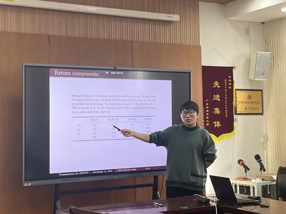 王泽荣分享的主题为“Option Pricing with Intraday and Overnight Underlying Asset Dynamics”。他发现交易期间和非交易期间的资产价格动态存在显着差异,基于此,他建立了一个新的GARCH 类期权定价模型。接着他从模型的设定和模型在波动率预测、期权定价、风险溢价三方面的应用来介绍该模型。该模型不仅可以有效刻画日内和隔夜收益率的联合动态,也可以捕捉比基准 GARCH 模型更负的条件偏度,同时也存在封闭式期权定价公式。