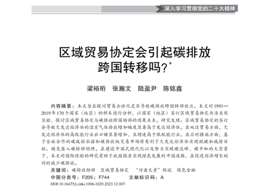 近期,我院2020级本科生陆盈尹、陈铭鑫与金融工程系教师梁裕珩博士、金融学系教师张瀚文博士合作撰写的论文《区域贸易协定会引起碳排放跨国转移吗?》被高水平学术期刊《国际金融研究》(2023年12期)发表为本期封面文章。《国际金融研究》是北大核心、CSSCI、社科基金资助期刊,在国内金融领域具有广泛影响力。该文的成功发表是我院不断增强学生创新意识、提升科研能力的生动体现,进一步展现了我院“金鹰计划”师生共研项目在培养学生学术科研能力方面的成效。