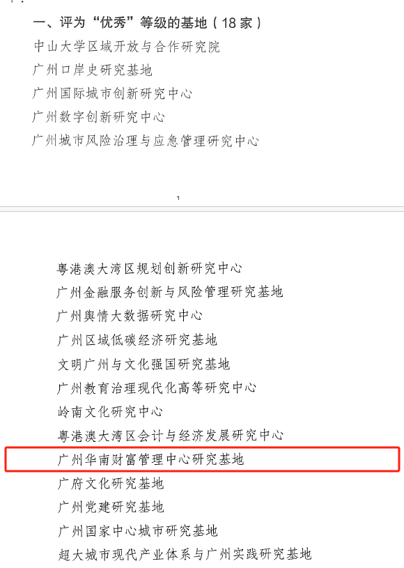 2024年4月15日,依托金融学院建设的广州市人文社科重点研究基地——广州华南财富管理中心研究基地,在第六轮广州市人文社科重点研究基地考核验收中获评“优秀”等级,本次共有60家市人文社科重点基地参与考核验收评审,18家获评为优秀等级。