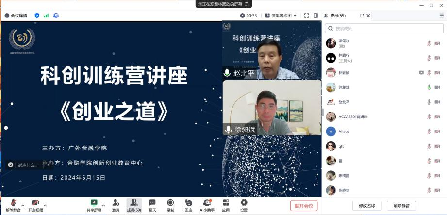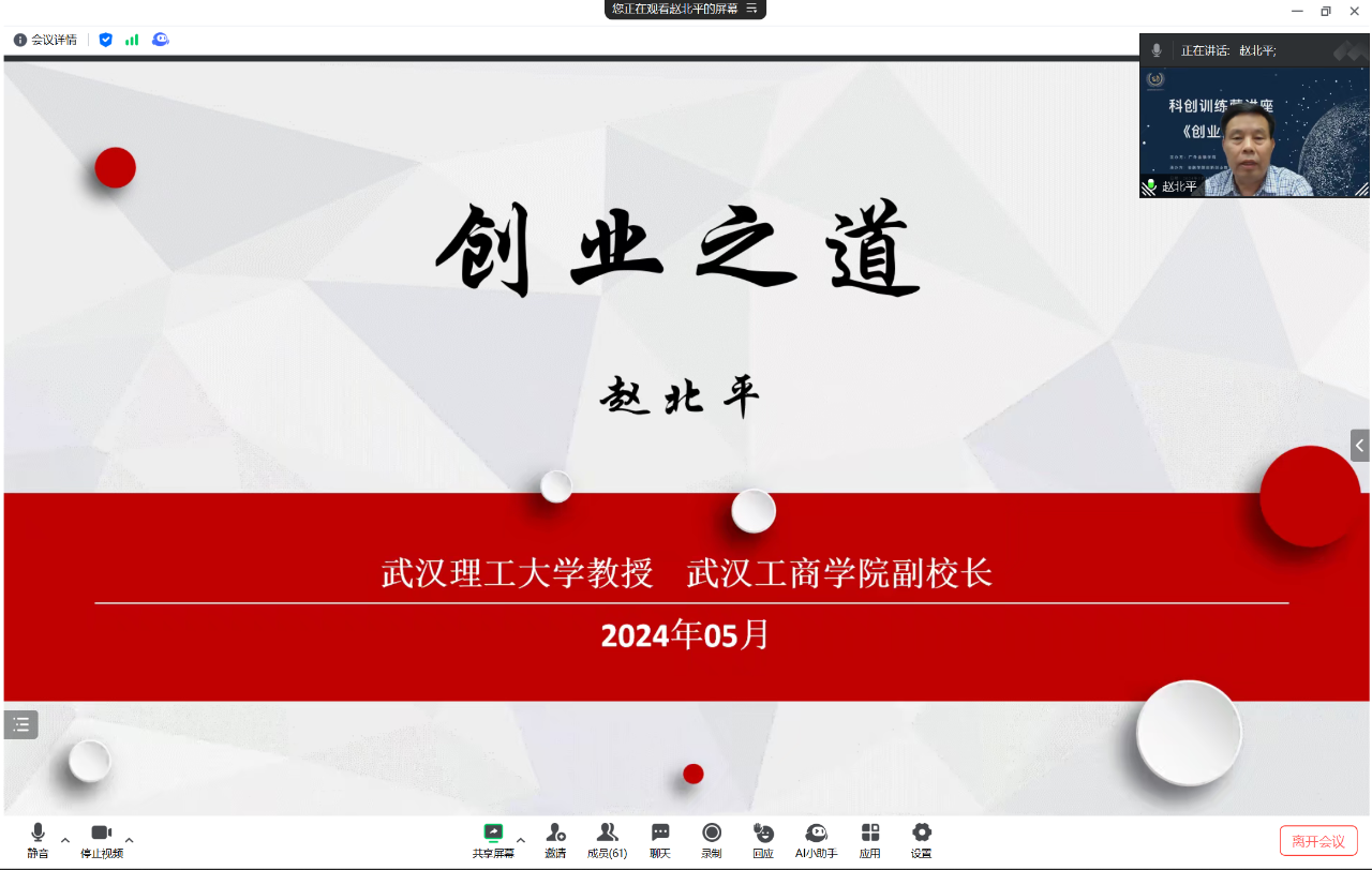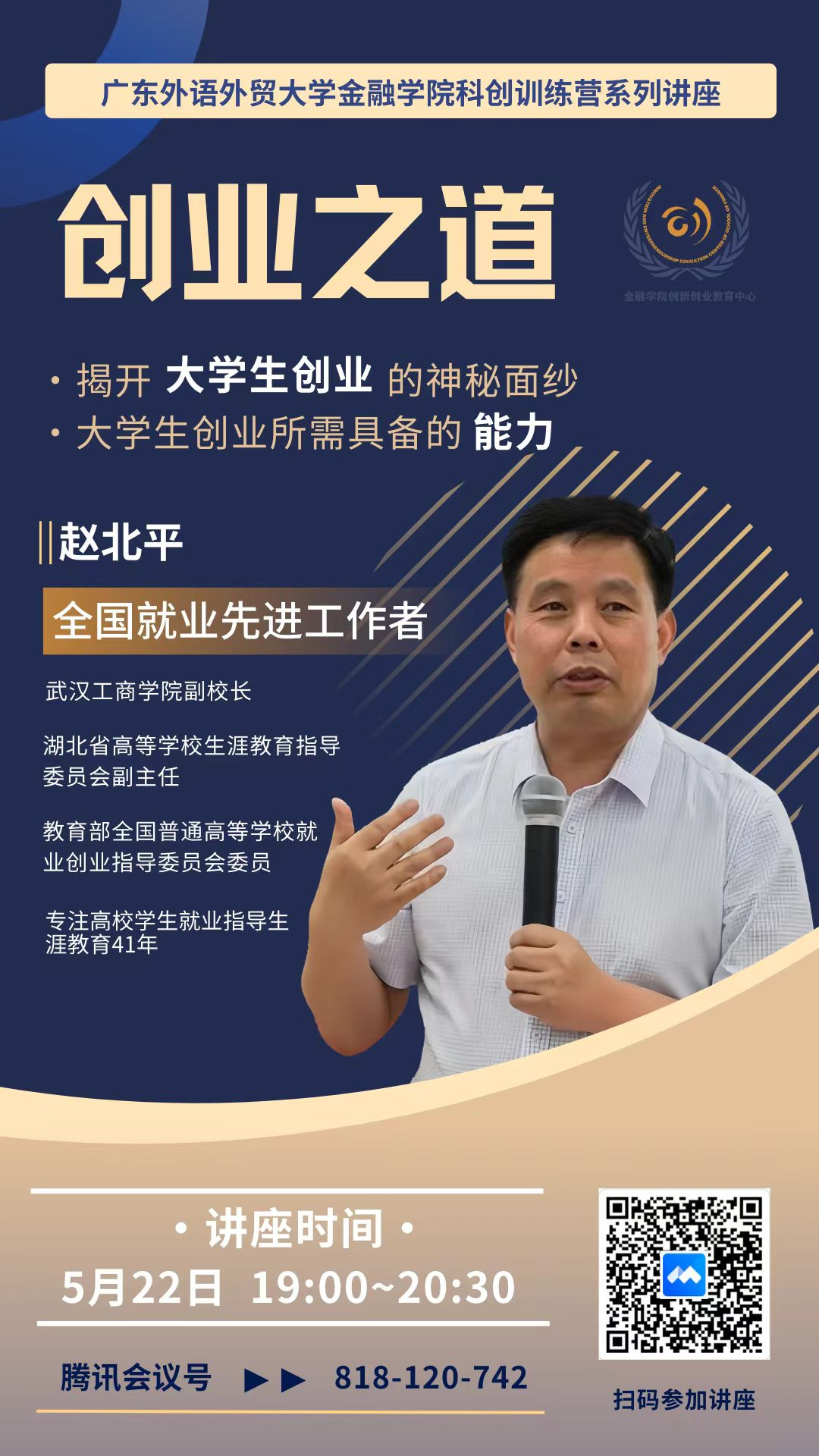 5月15日晚,金融学院“科创训练营”再次开讲。本次讲座以在线方式进行,特别邀请到武汉工商学院副校长,原武汉理工大学学生就业指导中心主任,创业学院首任院长赵北平作为主讲嘉宾,为大家带来了主题为“创业之道”的精彩演讲。活动由我院党委书记徐昶斌主持。