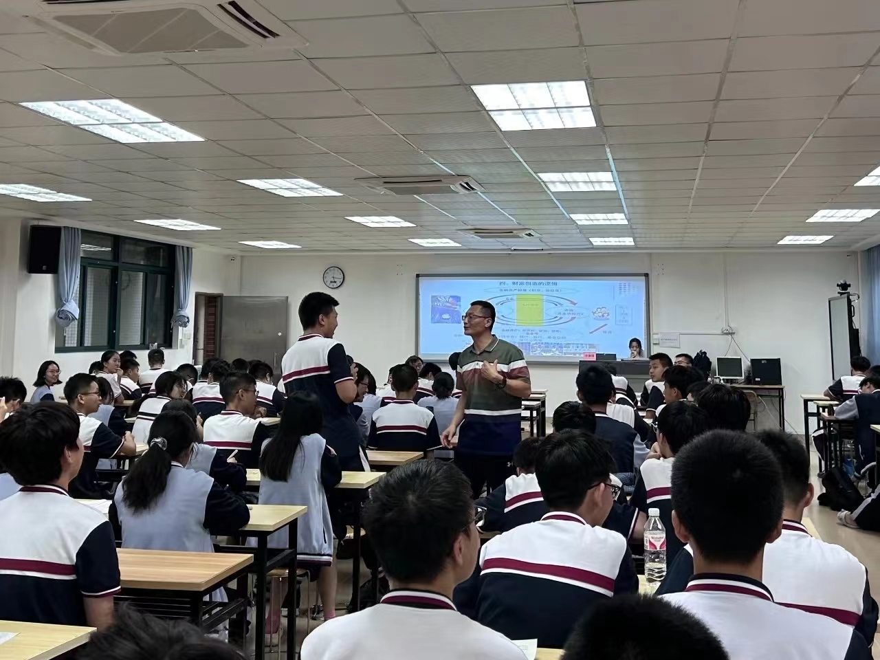 仪式结束后,许振国为象贤中学高一年级重点班的120名优秀学子带来了一场别开生面的广外宣讲及金融素养示范课。他通过深入浅出的案例分析和互动问答等形式,将金融知识生动地融入到日常生活场景中,使学生们深刻理解了金融知识在现实生活中的应用。从货币的时间价值到投资理财的策略,再到金融市场的运作,象贤学子们在轻松愉快的氛围中,深刻感受到了金融学科的魅力和实用性。除了金融知识的普及,许振国还向学生们介绍了广外及金融学院的办学特色、师资力量和就业前景等方面的情况,激励学生们努力奋进,追求自己的学术梦想。这节金融素养示范课不仅拓宽了象贤学子的视野,激发了他们对金融学科的兴趣和热情,也为他们未来选择理想大学与专业提供了有益的参考。