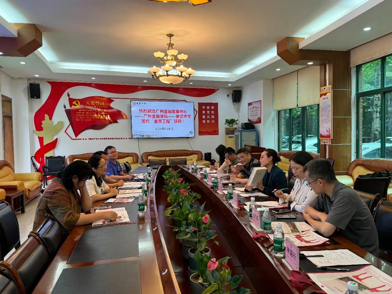 随后,我院师生一行来到广东省国家级示范性普通高中广州市番禺区象贤中学,与校方、广州金融发展服务中心共同举行了“金育工程”青少年金融素养教育项目签约仪式。象贤中学校长张英,副校长李钜坤、黄冬梅等热情接待我院一行。