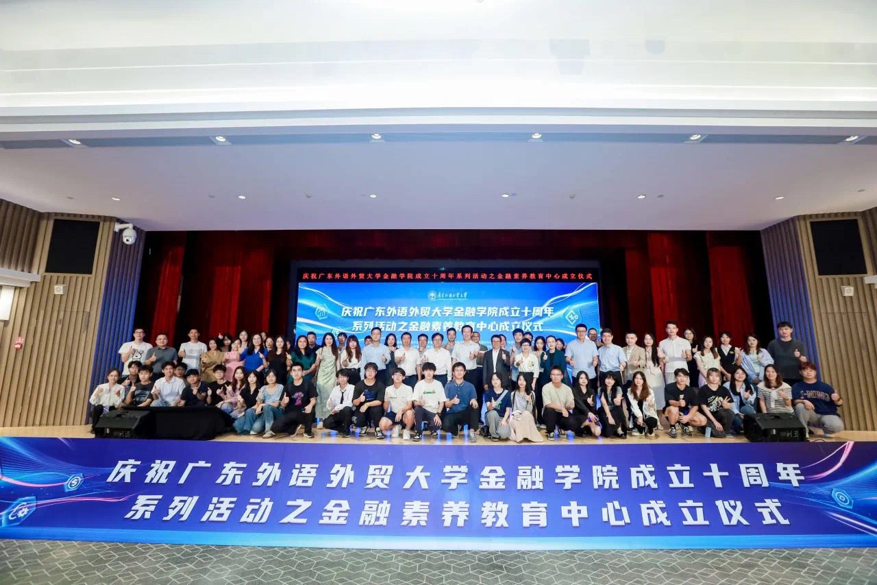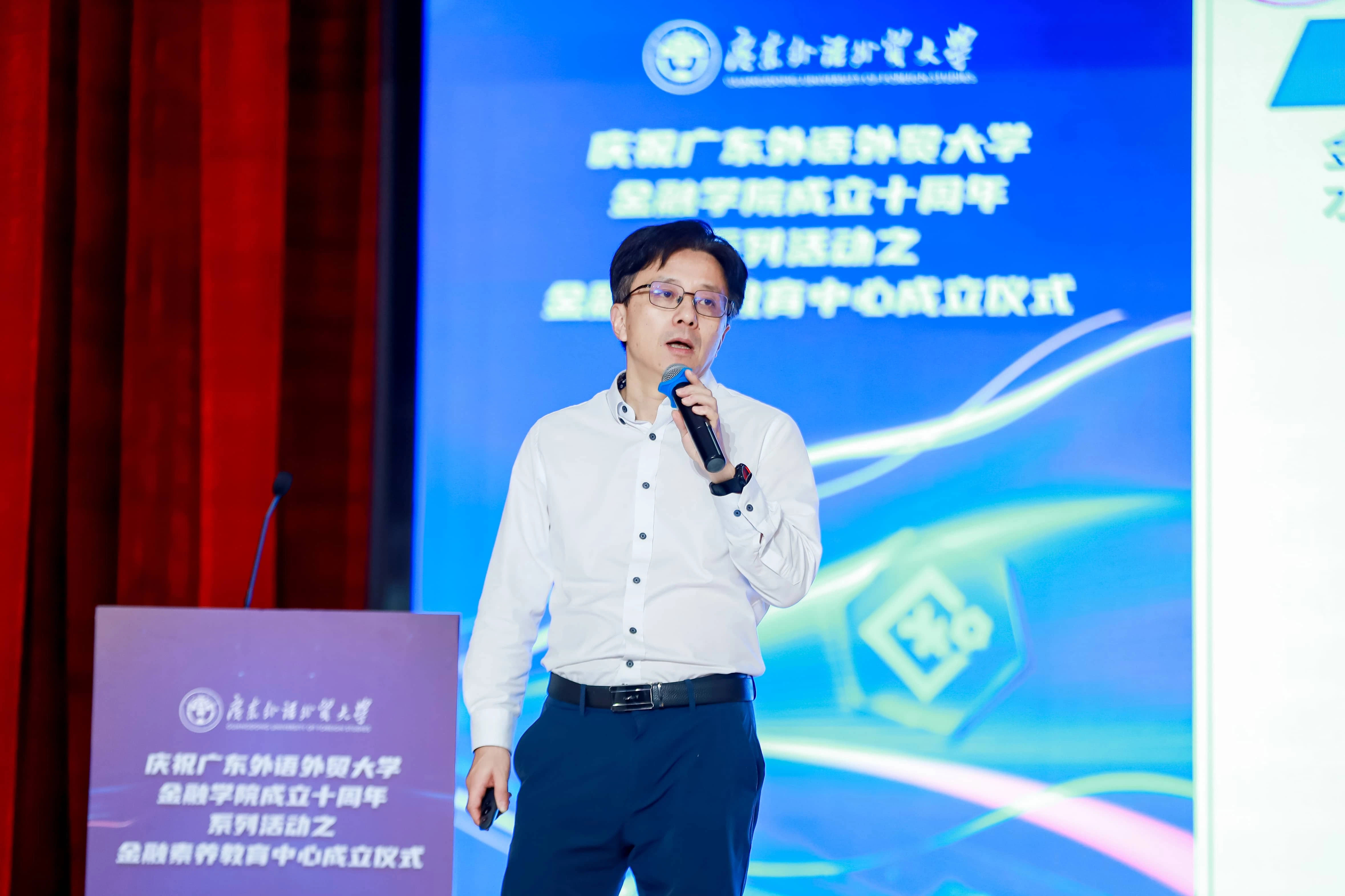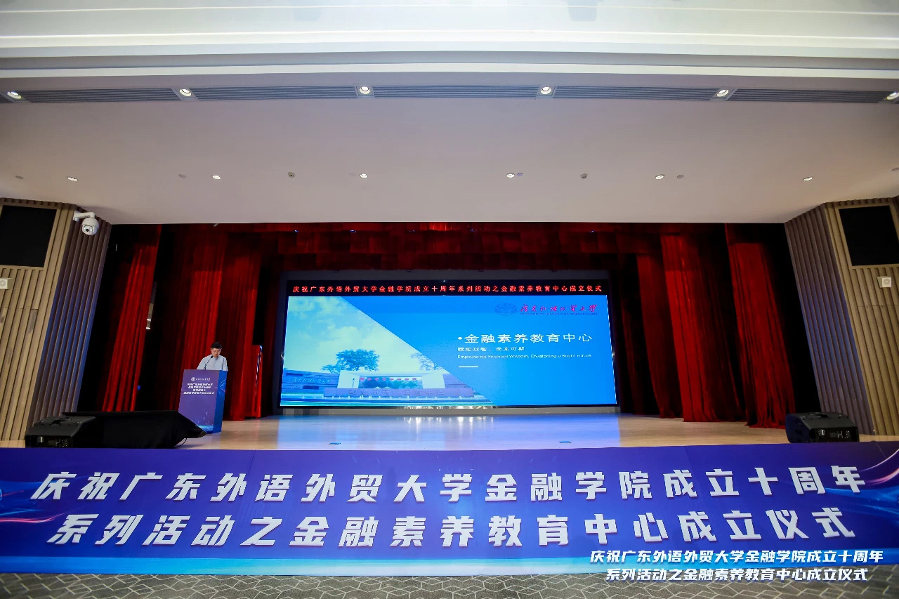 为深入学习贯彻习近平总书记在省部级主要领导干部推动金融高质量发展专题研讨班开班式上的重要讲话精神,积极培育中国特色金融文化,切实提升国民金融素养,7月1日下午,由广东外语外贸大学金融学院(以下简称“我院”)主办,佛山市南海区桂城中学(以下简称“桂中”)和广州金融发展服务中心(以下简称“广金服”)协办的庆祝广东外语外贸大学金融学院建院十周年系列活动之金融素养教育中心成立仪式在广州(国际)科技成果转化天河基地(以下简称“天河基地”)成功举办。中共广州市委金融委员会办公室副主任、广州市地方金融管理局副局长俞薇,广东金融学院副校长易行健,我校党委常委、副校长何传添,我院院长展凯等领导嘉宾莅临活动,来自广东地区27家金融企业(机构)、中小学校的代表以及我院师生百余人参加了活动。活动由我院党委书记徐昶斌主持。