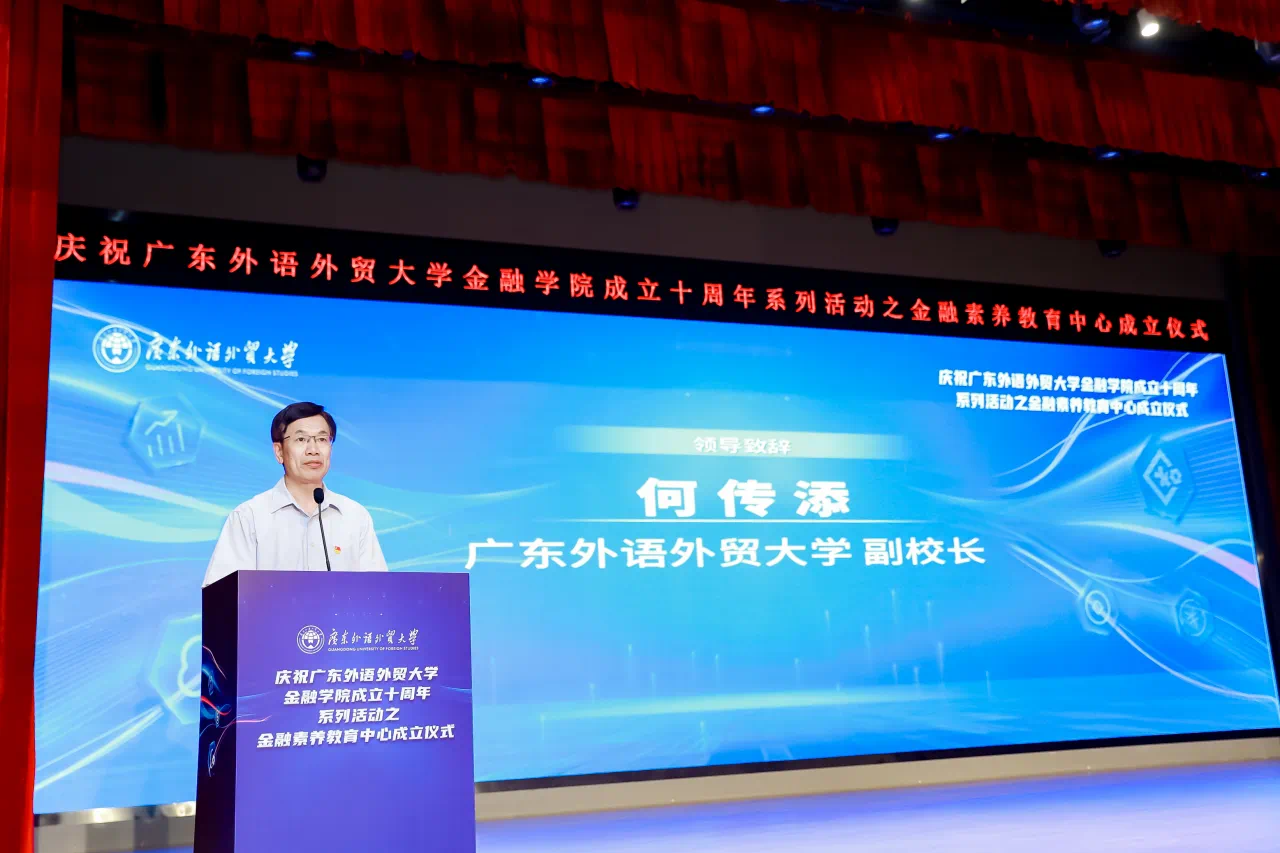 何传添代表学校对金融素养教育中心的成立表示祝贺,他在致辞中指出,近年来,学校(学院)勇于担当、主动作为,积极对接高中、企业、机构,派出专业教师团队直接服务于中小学,通过送特色课程进校形成“桂中模式”,派出学生金融素养团队送实践活动进校形成“潮实模式”,同时与广金服强强联手、协同合作推进“金育工程”,金融素养教育取得显著成效。金融素养教育中心的成立,应着力提升社会公众的金融素养和金融风险管理能力、广泛开展金融知识普及与实践活动、将金融知识纳入国民教育体系、促进高校高中协同育人,在建设金融强国实践中贡献“广外智慧”、提供“广外方案”。