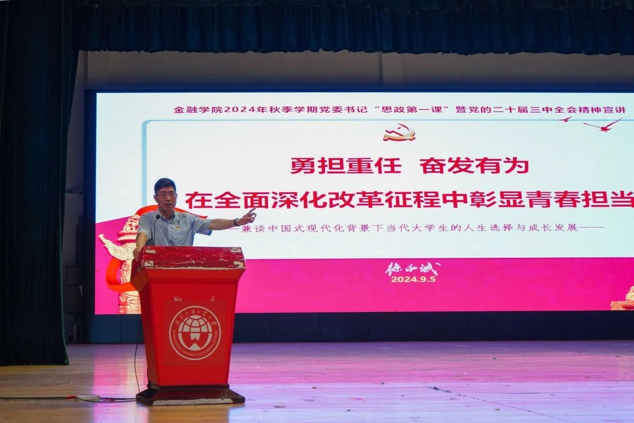 学院党委书记徐昶斌以“勇担重任,奋发有为,在全面深化改革征程中彰显青春担当——兼谈中国式现代化背景下当代大学生的人生选择和成长发展”为题讲授新学期“思政第一课”。他介绍了党的二十届三中全会召开情况,结合全会公报内容,阐述了全会精神及对教育、科技、人才之于中国式现代化的基础性、战略性支撑地位的理解。他指出,青年强则国家强,同学们应具有舍我其谁的担当精神和“敢教日月换新天”的创新改革精神,在新时代勇担民族复兴大任,要珍惜学习时光,在全面深化改革的伟大征程中迸发青春力量。随后,他结合自身对中国式现代化的认识理解,对青年学生的就业选择和成长成才提出自己的意见建议。他指出,在中国式现代化大背景下,大学生在学习中应正确对待人工智能,主动拥抱人工智能,发挥人工智能优势,将其作为辅助学习工作、提高个人生产力的工具。此外,他还跟同学们分享了该如何做好大学生涯及职业生涯规划,提醒大家要及早树立规划意识、学习规划知识,充分认识规划对于大学生涯的重要意义。最后,他勉励同学们要继承和发扬“明德尚行,学贯中西”的校训精神,在学习工作生活中展现广外金融学子自信昂扬,卓尔不群的风貌,践行使命与担当。