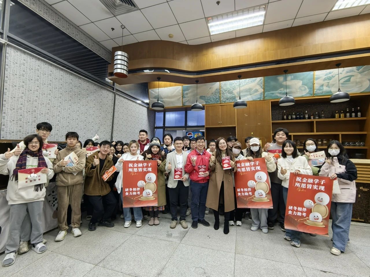 2025年全国硕士研究生招生考试“偶遇”冬至,金融学院特别举办“‘研冬’相伴,‘食’力助考”慰问活动。12月19日晚,学院党委书记徐昶斌,党委副书记张璇,院长助理、研究生工作办公室主任刘浩以及毕业班辅导员齐聚大学城校区云山书吧,为学子们送上冬至暖心汤圆和考研大礼包,祝愿他们能够旗开得胜,取得圆满的成绩。