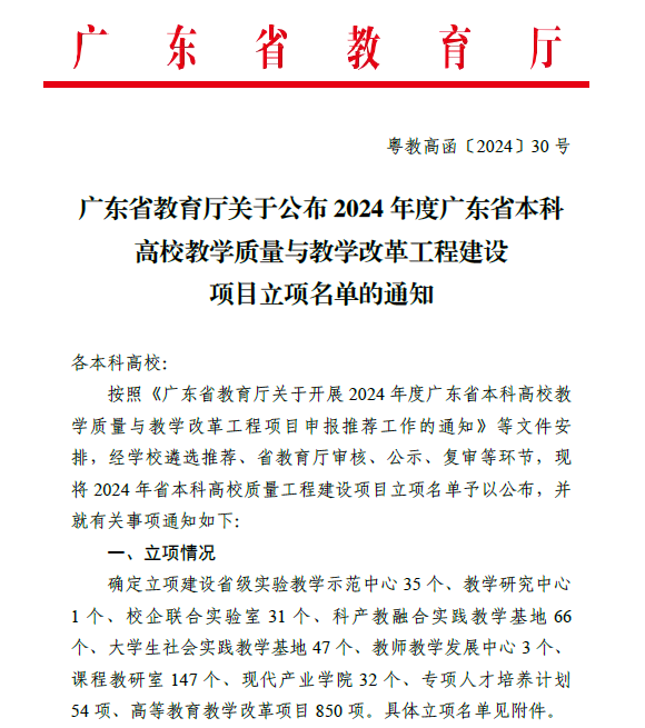 学院入选2024年度广东省本科高校教学质量与教学改革工程建设项目名单