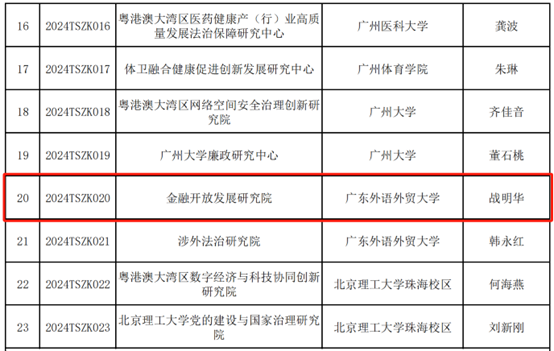 我院深入学习贯彻习近平总书记在省部级主要领导干部推动金融高质量发展专题研讨班开班式上的重要讲话精神,主动服务广东金融业高质量发展以及广州市国际金融枢纽和财富管理中心建设的重点工作,为各级政府提供决策咨询,进一步提升学院服务地方经济发展能力。在广东省教育厅公布的2024 年度普通高校重点科研平台立项名单中,我院申报的广东省普通高校特色新型智库“金融开放发展研究院”重点科研平台成功获批立项。