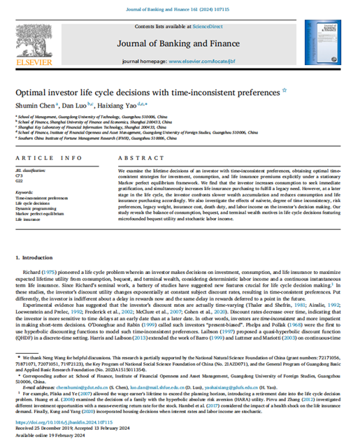 姚海祥教授的论文在金融学科国际一流期刊上发表