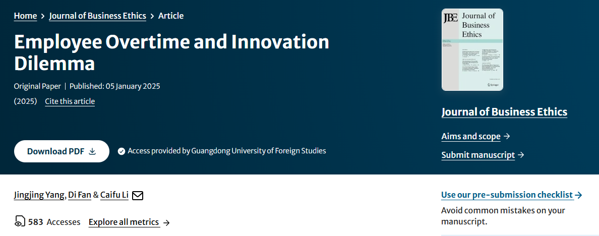 2025年1月,我院杨菁菁教授以第一作者在FT50期刊Journal of Business Ethics发表论文“Employee Overtime and Innovation Dilemma”,合作者为澳大利亚RMIT大学的Di Fan教授和广州商学院的李彩富。李彩富是杨菁菁教授指导的我院2023届金融学硕士研究生,2025年被录取为我院金融学博士研究生。
