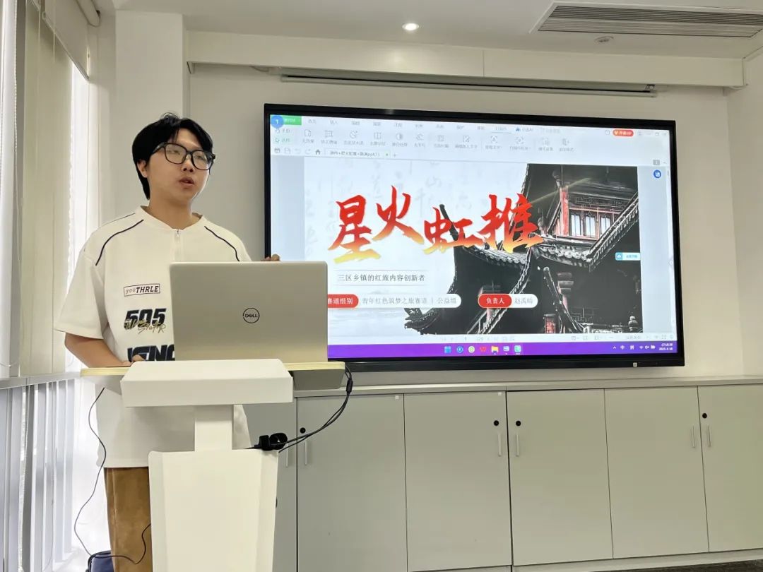随后双方围绕“党建引领高质量发展”展开深度对话。双方一致认为,校企党建共建是推动资源共享、优势互补的重要途径。在互动环节,师生们围绕大学生创新创业热门赛事、实习招聘深入探讨。双创党支部学生代表展示了“星火虹推”双创比赛项目,展现出广外青年学子在创新创业领域的蓬勃朝气与无限创意。红棉汇的老师们凭借深厚的行业积累与赛事指导经验,针对项目提出了诸多专业且极具建设性的意见。