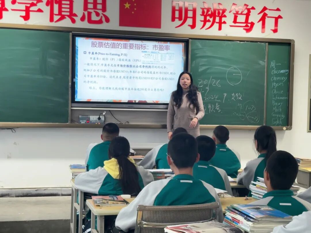 课堂上,授课教师——广外金融学院2025级研究生、正在当地支教的研究生支教团成员陆晓君,以电影票房分账为切入点,引导学生层层拆解影视产业链背后的资本逻辑。从电影专项基金、税费缴纳,到院线分成、制片方收益,复杂的金融知识被转化为可触可感的现实案例。学生们在计算与讨论中,逐渐理解了资本市场运作的基本规律和“预期驱动”的投资逻辑。