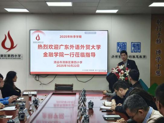 本次交流活动首站来到清新四小,该校党支部书记、校长孟庆忠,党支部副书记莫土华,副校长刘秋颜、潘少艺及学校部分中层干部代表全体师生对我院一行的到来表示热烈欢迎。清新四小秉持“雅以立诚、为以毅力”理念,深耕“雅慧教育”十余年。孟庆忠在谈及合作期待时表示,成为广外金融学院校地协同共建金融教育体系的合作学校,是对“雅慧教育”理念的高度认可。他期待通过广外精心准备的金融素养课程,为该校“雅味课程体系”注入新养分,帮助学生树立理性理财观念,切实提升金融素养,助力学生全面发展。