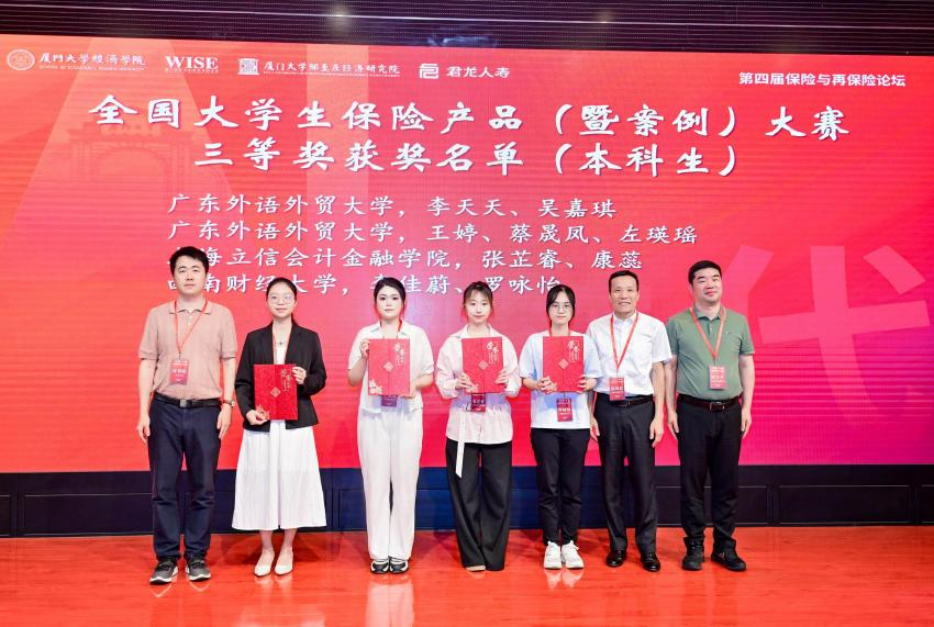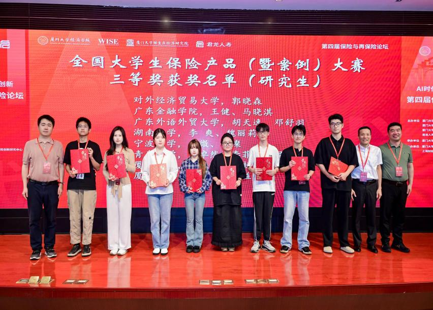 活动中,邓超在“加快建设金融强国,构建中国特色现代保险体系”论坛担任发言嘉宾;赵轶星在“养老与健康保险”平行论坛上报告了论文《Pricing a Guaranteed Annuity Option under a Stochastic Correlation Setting》。在全国大学生保险产品设计暨案例分析大赛中,我院学子表现突出,本科生李天天、吴嘉琪的作品《“知盾—科研星”AI模型研发转化综合保险》(指导老师:刘倩),左瑛瑶、王婷、蔡晟凤的作品《数智驱动下的绿色保险创新——供应链碳事件中断风险》(指导老师:邓超),以及研究生胡天逸、邓舒羽的作品《智驭安享:一种应对多重退休风险的智能保障顾问》(指导老师:孙晓珂)均荣获三等奖,充分展现了我院师生在保险理论与实践创新方面的综合实力。