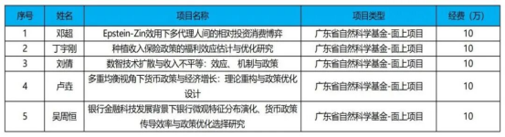 近日,广东省基础与应用基础研究基金委员会正式公布2026年度广东省基础与应用基础研究基金自然科学基金评审结果。我院科研工作再传捷报,凭借扎实的研究基础与前沿的选题方向,我院邓超、丁宇刚、刘倩、卢垚、吴周恒五位教师的课题成功获批广东省自然科学基金面上项目,拟资助总资金50万元。立项总量约占我校的33%,为全校第一,充分彰显了学院在金融科学领域的科研实力与创新潜力。