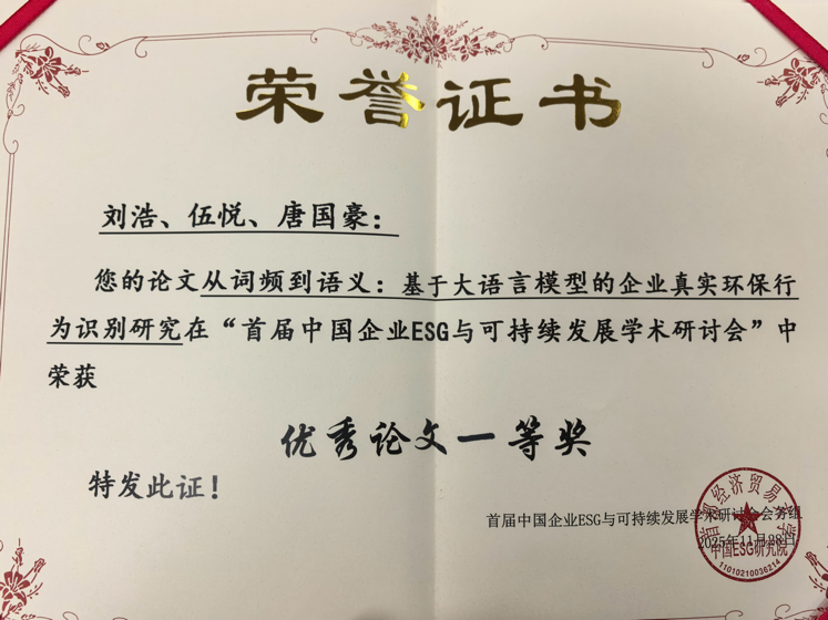 在论文评选环节,我院刘浩副教授、2022级金融学专业本科生伍悦与湖南大学金融与统计学院唐国豪副教授合作完成的论文《从词频到语义:基于大语言模型的企业真实环保行为识别研究》荣获“优秀论文一等奖”。此次获奖不仅是对我院科研实力的肯定,也再次证明学院在本科生培养中始终坚持研究导向的有效性。