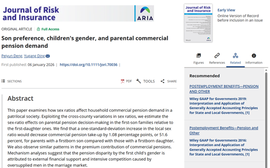 近日,广东外语外贸大学金融学院副教授、金融开放发展研究院研究员丁宇刚与上海外国语大学邓佩云老师合作的学术论文《Son preference, children's gender, and parental commercial pension demand》于国际重要期刊《Journal of Risk and Insurance》在线发表。