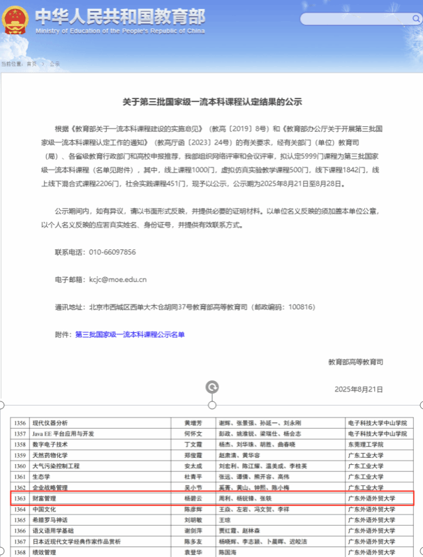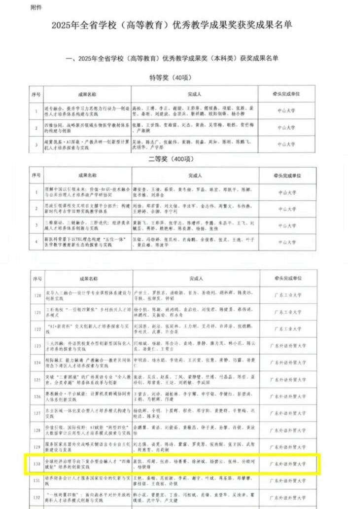学院以提升人才培养质量为核心,在教学核心环节取得一系列突破性成果。课程建设方面再获突破,杨碧云教授负责的《财富管理》课程凭借其创新的教学设计与扎实的线下教学成效,成功获认定为国家级一流本科课程。教材建设成绩显著,贺显南教授主编的经典教材《投资学原理及应用(第5版)》获评广东省首届优秀教材奖;展凯教授主编《科学养老规划》《保险学思政案例集》两部教材正式出版,有力支撑了专业课程教学与课程思政建设。教学改革成果获得权威认可,我院申报的《全球经济治理导向下复合型金融人才“四维赋能”培养的创新实践》荣获广东省高校(本科)优秀教学成果奖二等奖。
