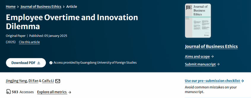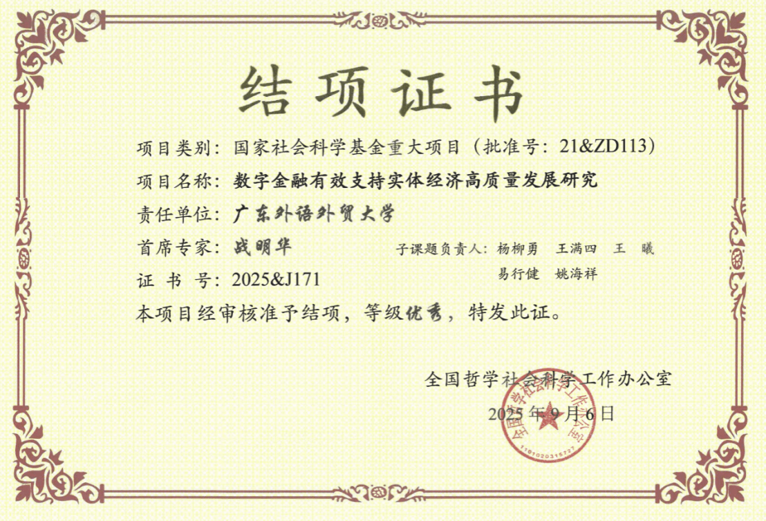 学院在高层次科研项目立项和研究生教学改革成果方面持续取得显著进展。战明华教授主持的国家社会科学基金重大项目《数字金融有效支持实体经济高质量发展研究》顺利结项,并获评“优秀”等级。在科研基金立项方面,学院累计获批国家自科基金和国家社科基金3项,中国博士后科学基金、广东省自科基金和广东省社科基金等省部级课题10项,科研项目层级和规模稳步提升。高水平成果产出方面,杨菁菁教授、刘媛媛副教授分别在FT50期刊Journal of Business Ethics各发表论文1篇,战明华教授在《经济研究》发表论文1篇,周利教授、王姝黛副教授、钟茜博士在《金融研究》累计发表论文4篇;同时,学院教师还在《管理科学学报》《世界经济》等国内外权威期刊发表论文50余篇。依托重要期刊论文的持续产出,金融学科成功上榜2025年软科世界一流学科排名位于全球151—200位。在教学改革方面,刘浩副教授获批广东省研究生教育创新计划项目立项,聚焦金融学硕士研究生培养模式改革,持续推动人才培养质量提升。