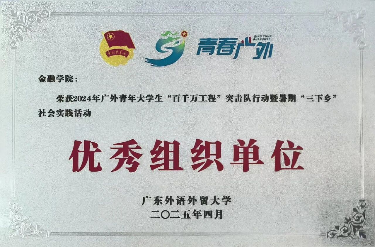 学院紧扣“立德树人根本任务”,本年度思想政治育人成效显著,学院学生工作考核评定为优秀等次。创新创业教育中心党支部(学生党支部)入选“省级样板党支部”,学院团委获评“五四红旗团委”、“百千万工程”突击队行动先进组织单位、“第二十届文体艺术节”优秀组织单位等多项荣誉,团委书记获评校“优秀共青团干部”。学工团队指导学生在乡村振兴、暑期社会实践等活动累计获省级奖项11项、校级奖项5项;文体领域捷报频传,金融女篮、男足获广外杯总冠军,排球队夺新生杯团体冠军,校运会获团体总分第三并获评“体育道德风尚奖”;学工队伍专业能力稳步提升,获教育部思政工作精品项目1项,主持校级以上科研项目14项、发表论文4篇,团队及个人获校级以上荣誉14项;学生在各类竞赛中表现亮眼,斩获国家级奖项28项、省级奖项40项。