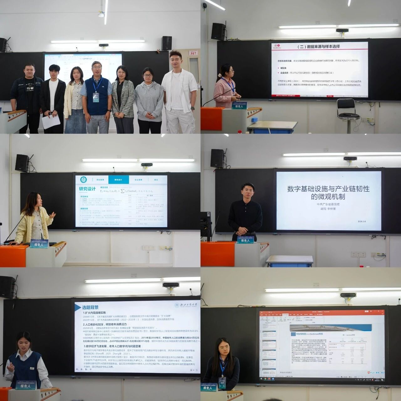 下午的专题论坛在广东外语外贸大学白云山校区第一教学大楼进行。专家学者们分别围绕“金融制度创新与市场风险治理”“创新驱动与产业升级” “数字赋能与产业升级” “结构变迁与绿色转型” 以及“风险管控与资源配置”五大主题展开深入讨论。