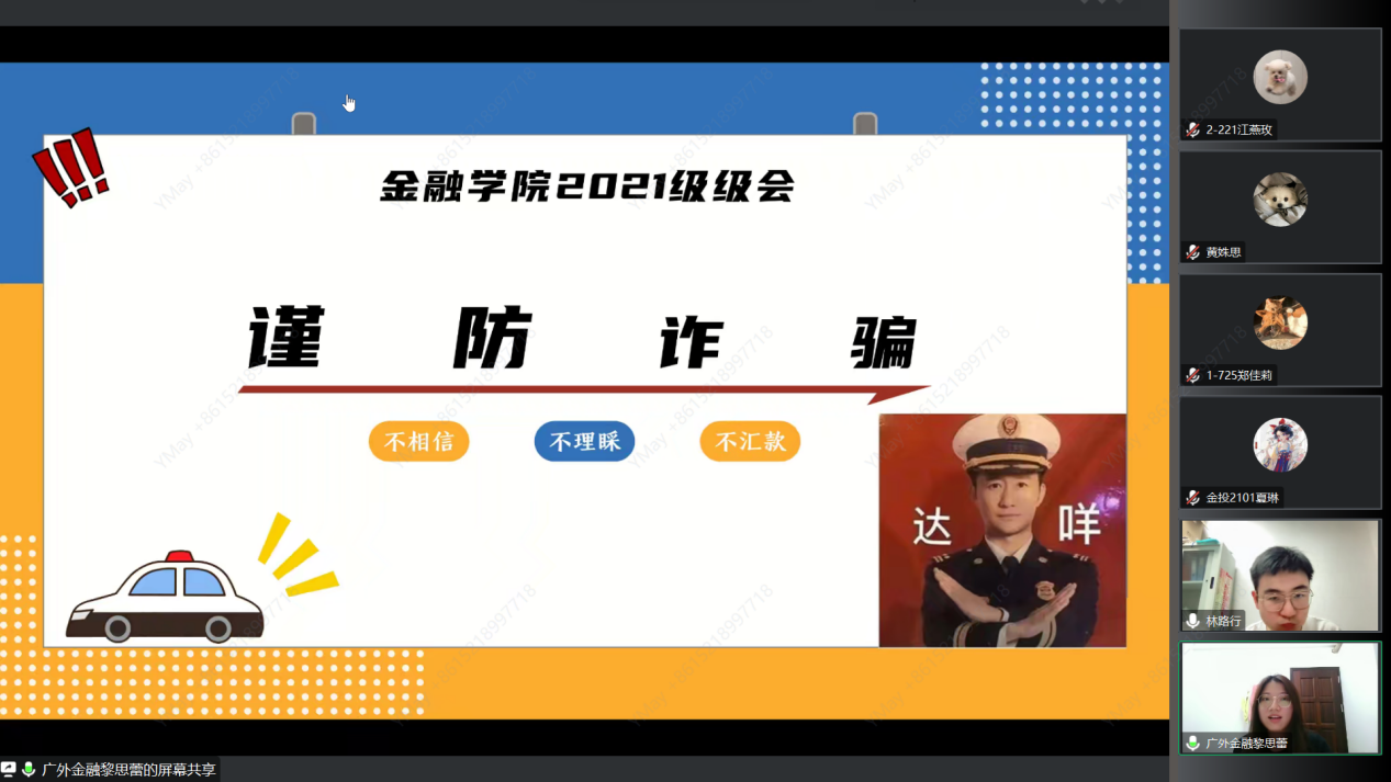 黎思蕾分别从何为诈骗、诈骗类型及如何预防诈骗三方面进行讲解,提示同学们在假期期间要谨防诈骗。无论是常见的网络诈骗、常有的冒充公检法诈骗或最近频发的招聘兼职诈骗等各种诈骗类型,我们都要做到“三不”——不相信、不理睬、不汇款。黎思蕾强调,生活中我们要积极树立反诈意识、切勿贪小便宜。若不慎发现自己受到诈骗,要保持冷静并迅速报案,争取及时挽回受到损失。同时平时保管好个人信息、加强账户管理、在生活中注重支付习惯。