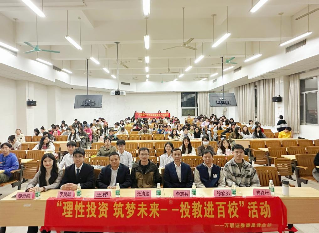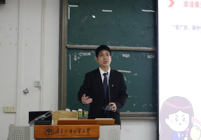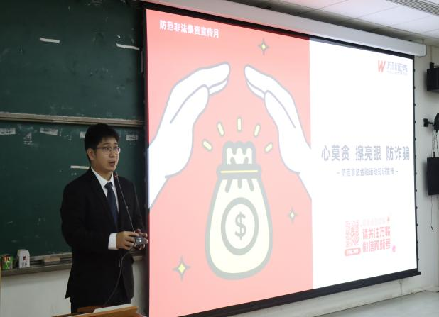 为提升我校学生防范非法金融活动的意识和辨别金融诈骗的能力,2023年12月7日晚,我院双创党支部下的金识满金融素养教育志愿服务队联合万联证券股份有限公司番禺营业部在广东外语外贸大学(大学城校区)教学区C座208共同开展题为《心莫贪、擦亮眼、防诈骗——防范非法金融活动知识宣传》的公益宣讲活动。
