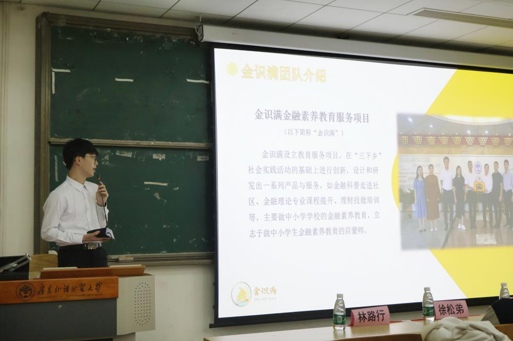 活动最后,为号召更多的青年学生共同助力我国金融公益事业发展,我院双创党支部下的金识满金融素养教育志愿服务队向参与活动的师生简要介绍了目前正在开展的《“金育工程”——青少年金融素养教育》项目,阐述了青少年金融素养教育对社会发展与进步的重要性,并希望能有更多的青年能够成为“火种”,传播光与热,传播金融知识。