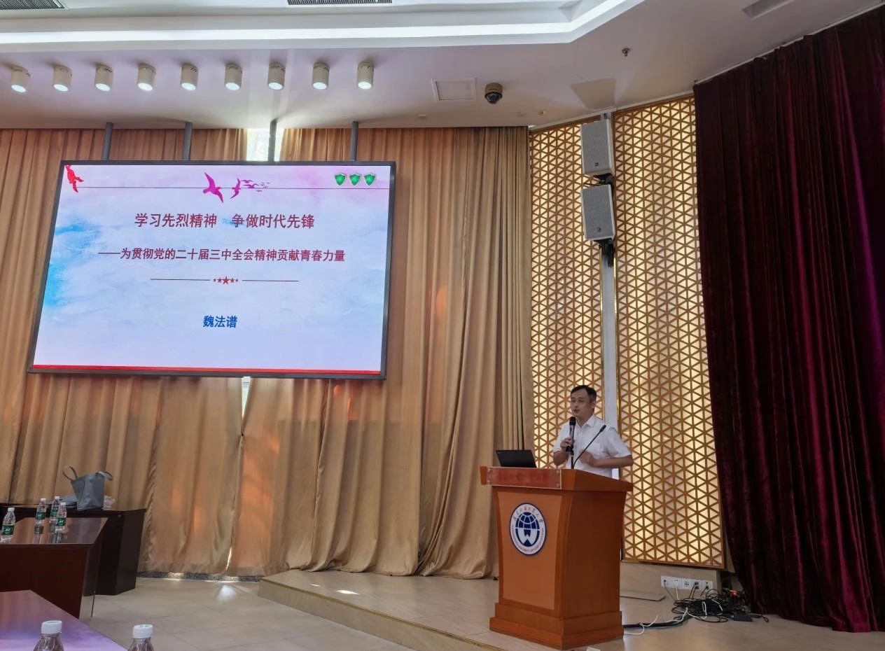主讲人魏法谱老师就“学习先烈精神,争做时代先锋——为贯彻党的二十届三中全会精神贡献青春力量”的主题进行分享。他与师生一起回顾了中共党史上的“广东人”印记,介绍了早期中共党员对广东以及社会的历史贡献,让师生深刻领悟到革命先烈的精神内涵。他指出,广大青年是全面深化改革开放的强大生力军、勇敢突击队、接续奋斗者,鼓励同学们坚定理想信念,练就过硬本领,锤炼品德修为,在全面深化改革开放中放飞梦想、激扬青春,书写无愧于时代的壮丽篇章。