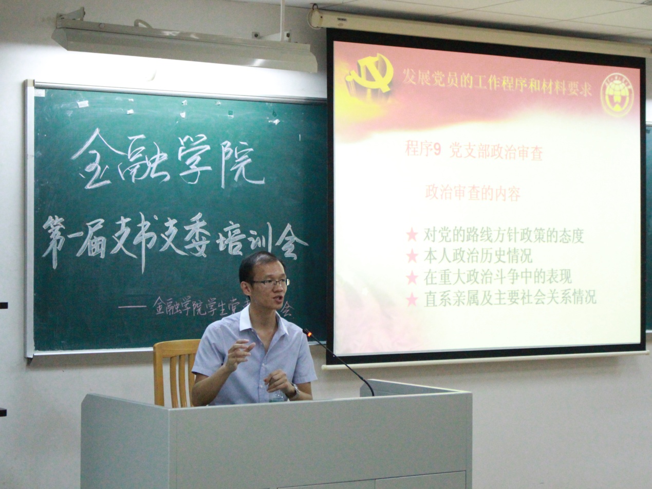 2014年10月16日晚上7点,金融学院2014年第一届党支部支委培训会在教学楼F307正式召开。与会的有金融党建指导老师叶祥杰以及金融学院各级学生党支部的支书支委。