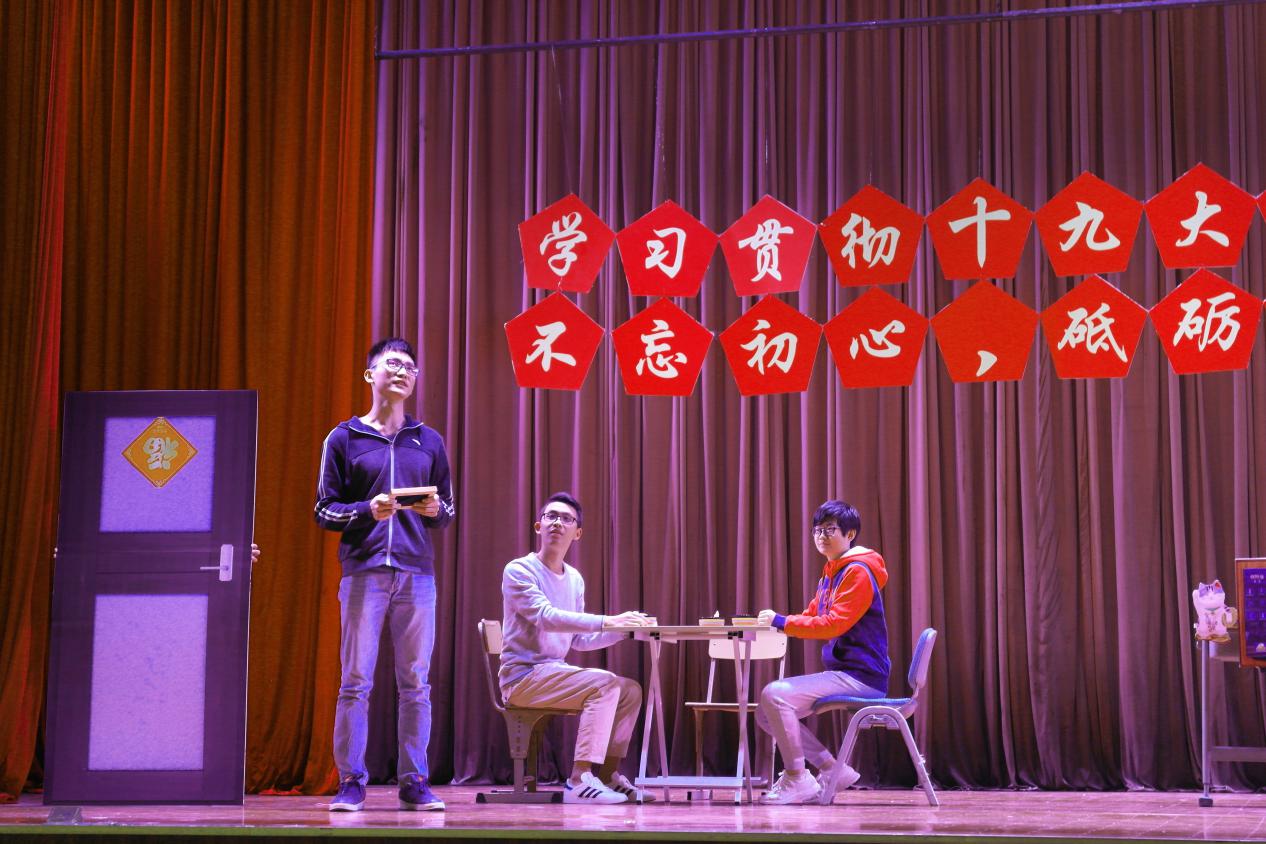 第三个节目是2015~2017级金投数学保险学生党支部的情景剧《老杨进城》。该节目通过一名村干部老杨进城前后的所见所闻来展现时代的飞速发展:村里的耕地变成了蔬菜基地,无人餐厅无需现金结账,科技馆里的智能机器人有望普及还有电商的快速发展······这些都体现了当今社会科技的发展及进步,而这一切都得益于始终坚持党的领导,高举中国特色社会主义伟大旗帜,走中国特色社会主义道路。