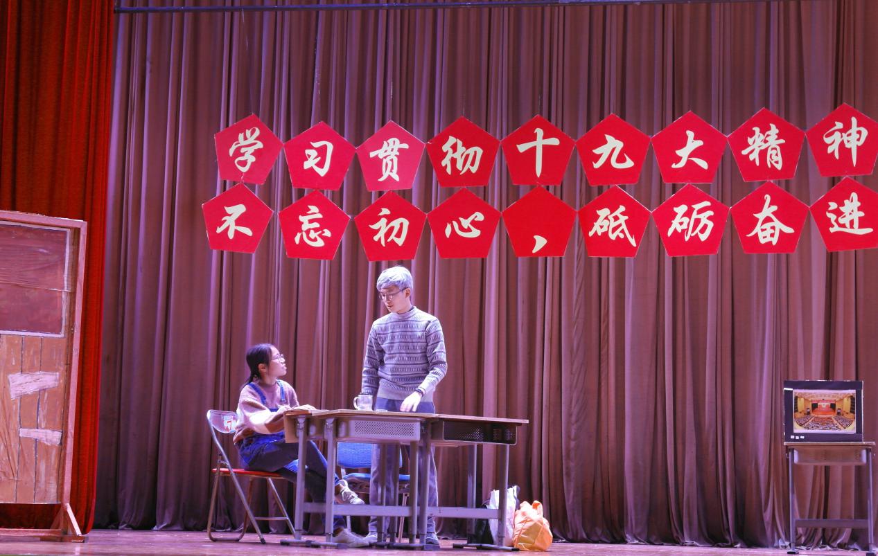 最后一个是2015~2017级金工学生党支部的节目《勤奋脱贫》。该情景剧讲述了一位曾经懒惰颓废且爱酗酒的贫困户在村党员干部的热心帮扶下成功脱贫的故事,表现了党员干部对于脱贫工作的认真负责。节目通过现实与过往的对比,反映了党和政府在脱贫工作所取得的成就,同时,节目引导新一代青年要养成勤俭节约的好习惯。