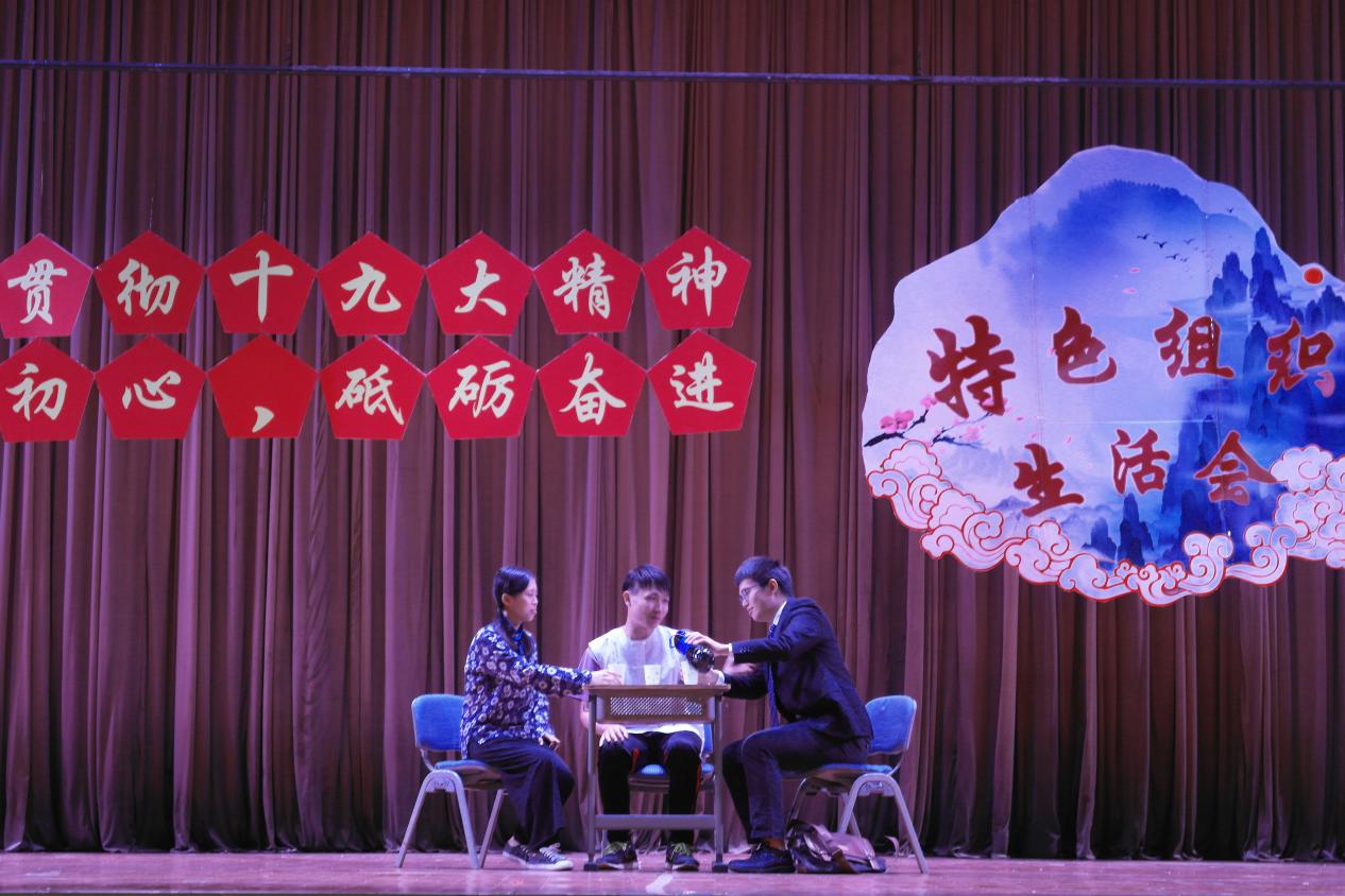 接着到2015~2017级金融第二学生党支部带来他们的表演——《时代见证》,节目以情景剧的形式,讲述了一名国企员工在改革开放初期辞职下海经商并取得成功的故事,展现了改革开放这一伟大政策给中国社会带来的巨大影响。改革开放后,社会经济发展迅速,人民生活日益变得美好。最后,该队伍也进行了深情朗诵,引发了在座观众对改革开放时代发展的思考及感慨。