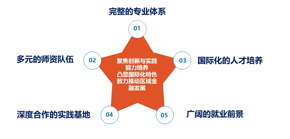 我院已形成鲜明的办学特色:构建了完整的专业体系,并拥有一支多元化的优秀师资队伍。我们聚焦于培养学生的创新与实践能力,与多家机构共建深度合作的实践基地。同时,学院注重国际化人才培养,彰显国际化特色,并凭借高端的社会服务,致力于推动区域金融发展。