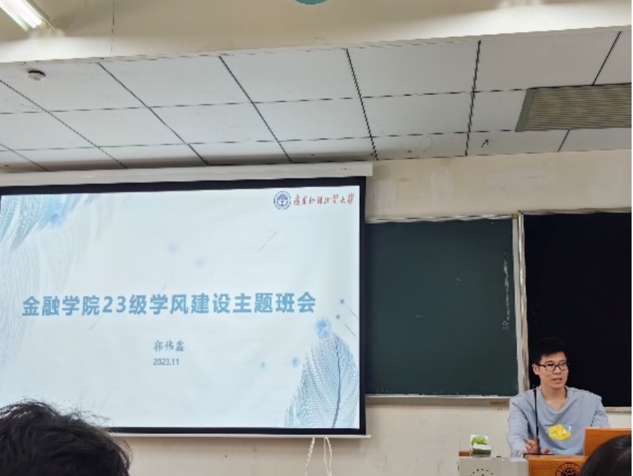 辅导员郭伟鑫,讲述了我校学生管理的相关规定,包括学分制度、综合测评方案、奖学金评选、宿舍管理规定、晚归与逃课旷课等违纪处分条例,结合10月30日至31日在北京召开的中央金融工作会议,郭伟鑫鼓励同学们在学习中要加强对金融学科的学习了解,积极了解国家金融发展战略,引导同学们从多个渠道获取有用信息,充分运用学校资源,如知网、CSMAR经济金融研究数据库、CEIC数据库等图书馆资源获取各种学习资料。