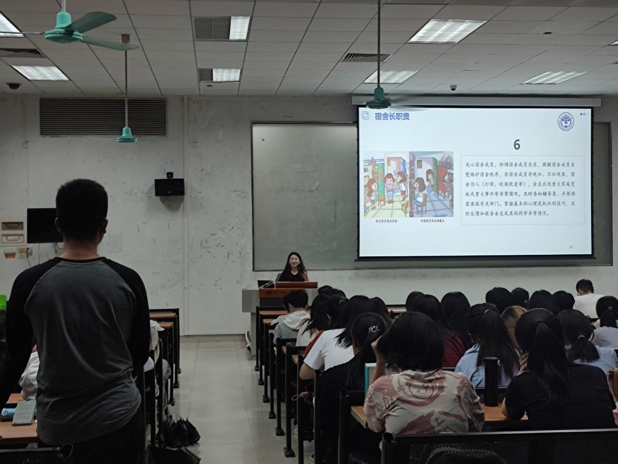 会议从宿舍长角色定位与工作职责、如何建立良好宿舍关系、学生宿舍管理须知以及普及心理知识四个方面进行专题培训。会上,张桂馨以《广东外语外贸大学学生宿舍管理规定(试行)》《广东外语外贸大学学生违纪处分规定》等文件为依据,介绍了与宿舍活动空间相关的违规情况的处分规定和对个人未来发展的产生的后果,同时运用宿舍违规用电行为而发生火灾的例子,提高各宿舍长对宿舍相关安全产生防范和警惕意识。她强调,宿舍长有责监督宿舍卫生、引导室友树立安全防范意识和处理宿舍关系。张桂馨重点介绍了宿舍心理健康的知识和常见心理问题的主要症状,并结合具体案例就如何预防心理危机进行讲解,最后,她介绍了我校心理咨询的服务资源。