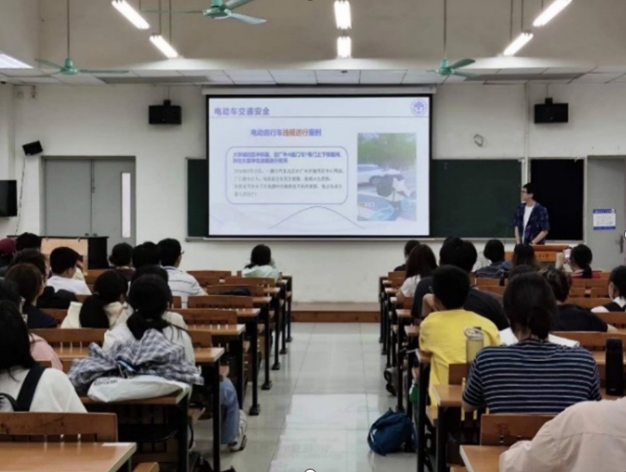 随后,郭伟鑫介绍了近期有关校园电动车的安全问题,他指出近期常有关于电动自行车消防安全的案例发生,主要包括电动自行车自燃、电池鼓包、充电爆炸、违规载人、不带头盔等案例,因此同学们在日常出行务必要注意安全,遵守交通规则,不超速行驶,不逆向行使,避免交通事故的发生,严令禁止私带电动自行车电池回宿舍充电。郭伟鑫还倡导同学们积极参与校园交通管理,遵守各项交通规则,营造安全有序的出行环境,共筑和谐校园。